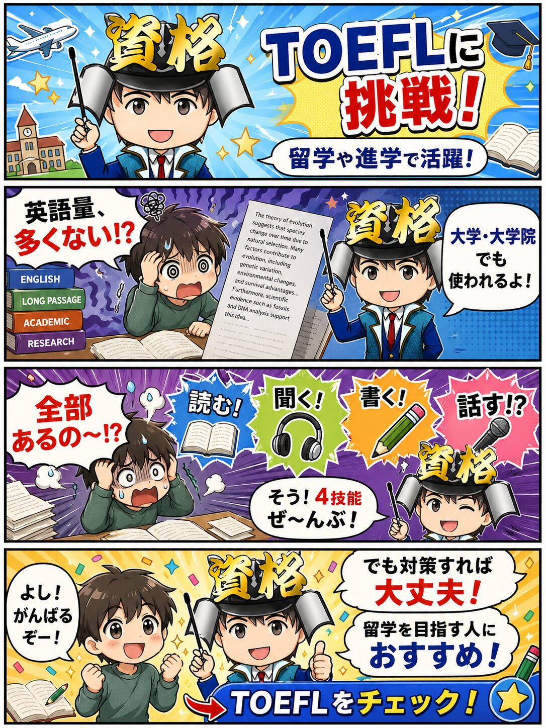 リーディング・リスニング・スピーキング・ライティングの4技能が問われるため、難易度は高めです。大学レベルの講義や学術的な文章を理解する力も必要になります。