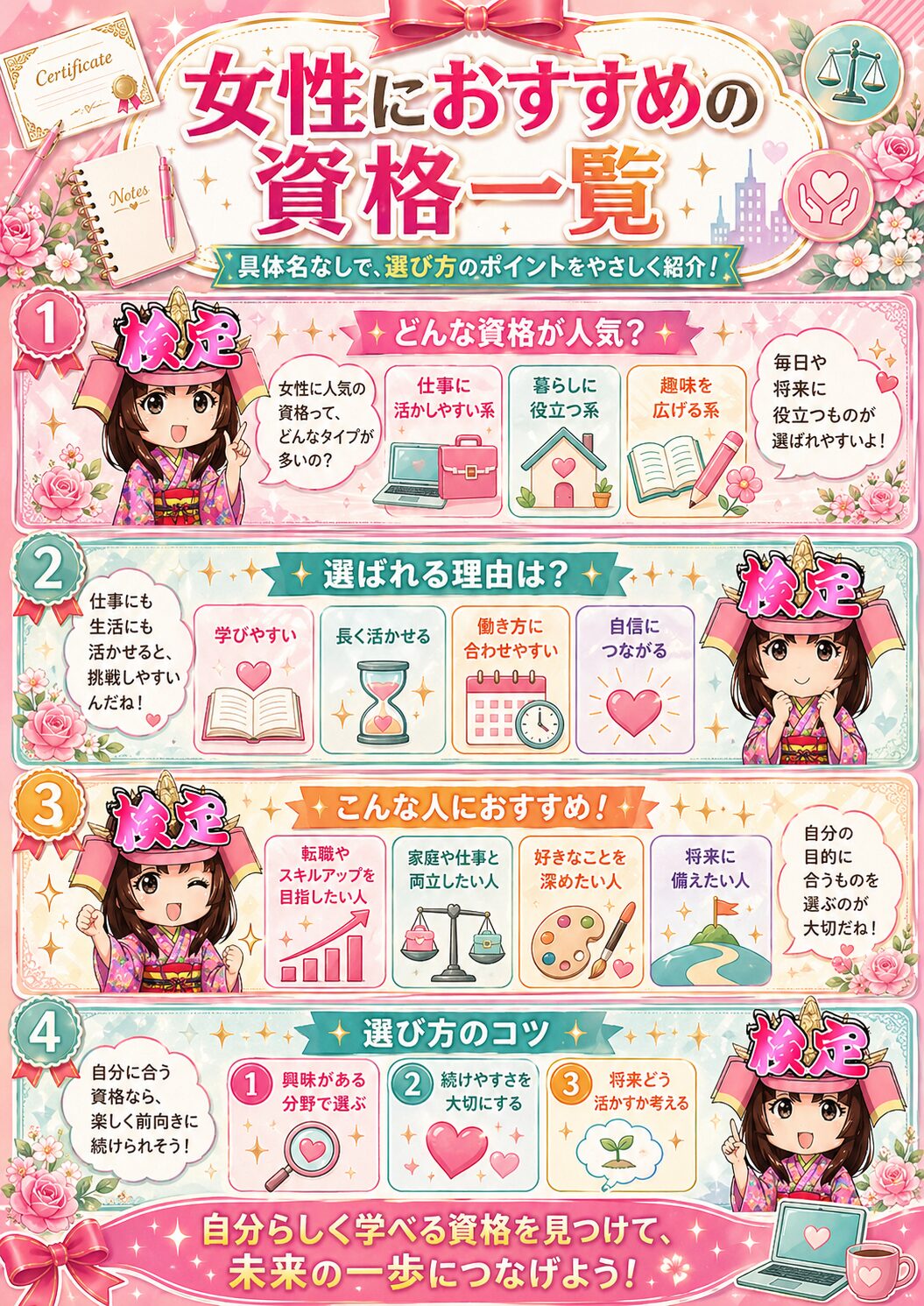 資格は、ただ履歴書に書くためだけのものではありません。自分の得意分野を見つけたり、未経験の仕事に挑戦するきっかけになったり、今の職場で評価される材料になったりします。
